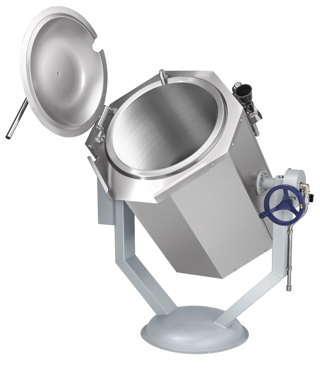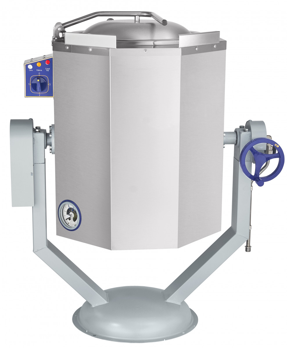 Такая конструкция облегчает санитарную обработку и повышает долговечность оборудования. Нагрев осуществляется через пароводяную рубашку, благодаря чему тепло распределяется равномерно, а содержимое прогревается без пригорания. Откидная крышка фиксируется в верхнем положении, что упрощает загрузку ингредиентов и контроль приготовления.