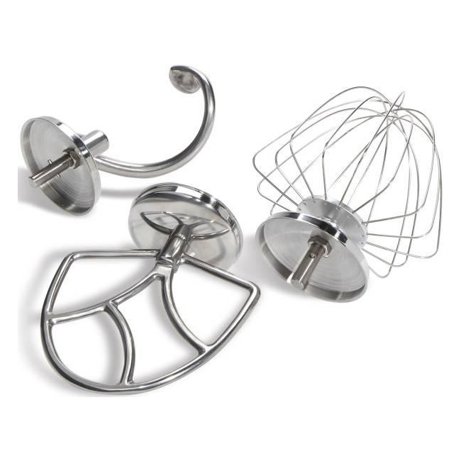 В комплект входит проволочный венчик для взбивания легких кремов, крюк для замеса густого дрожжевого теста и плоская лопатка (битер) для перемешивания фарша, бисквитного теста и начинок.