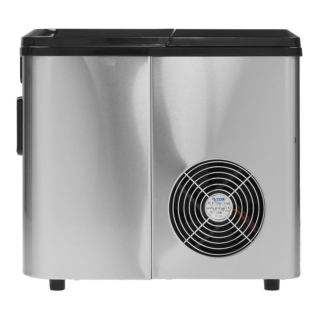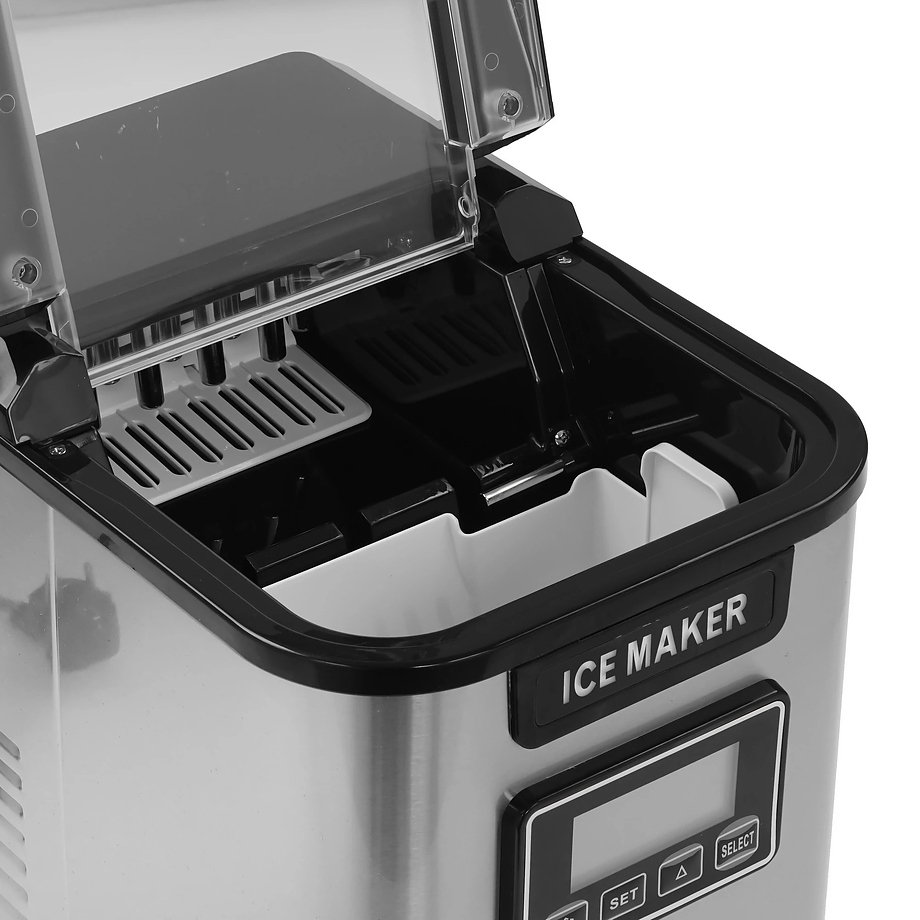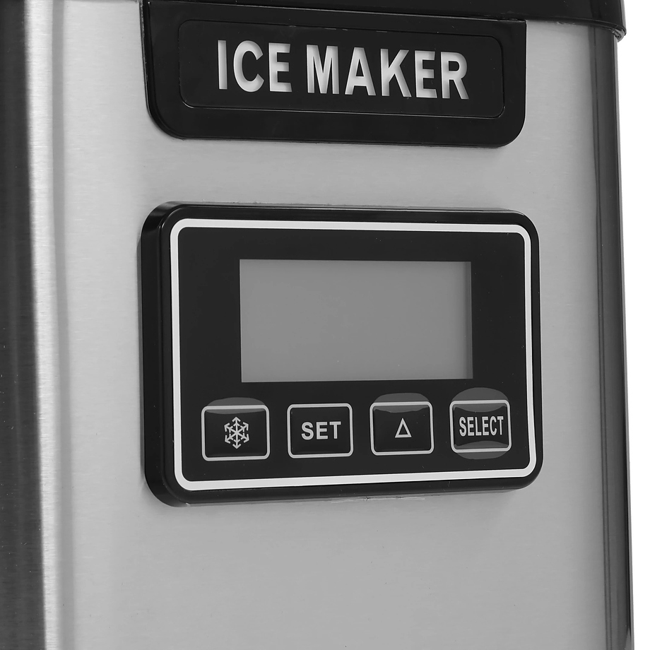 Корпус устройства выполнен из нержавеющей стали, устойчивой к коррозии и механическому воздействию. Крышка изготовлена из пластика и оснащена смотровым окном для контроля процесса. Кнопочная панель с жидкокристаллическим дисплеем и таймером делает процесс настройки и эксплуатации льдогенератора легким и комфортным.