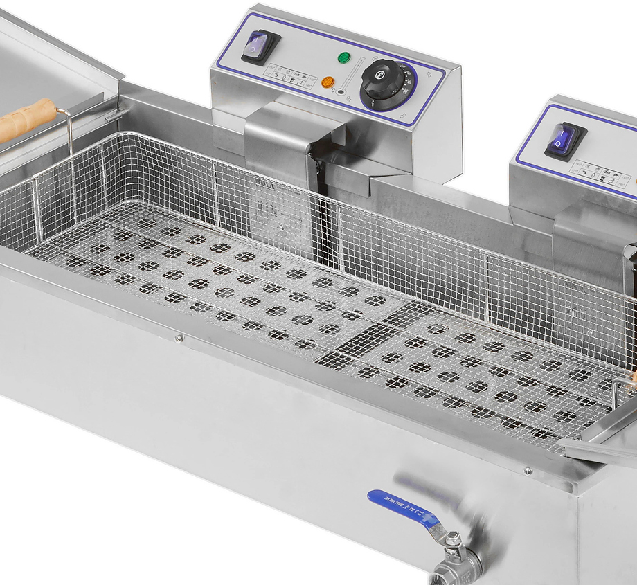 Отдельное внимание уделено организации рабочего процесса. Поддон для готовой продукции позволяет сразу выкладывать изделия после жарки, не занимая основную рабочую поверхность. Кран для слива масла упрощает обслуживание и делает замену масла более быстрой и аккуратной, что особенно важно при интенсивной эксплуатации.