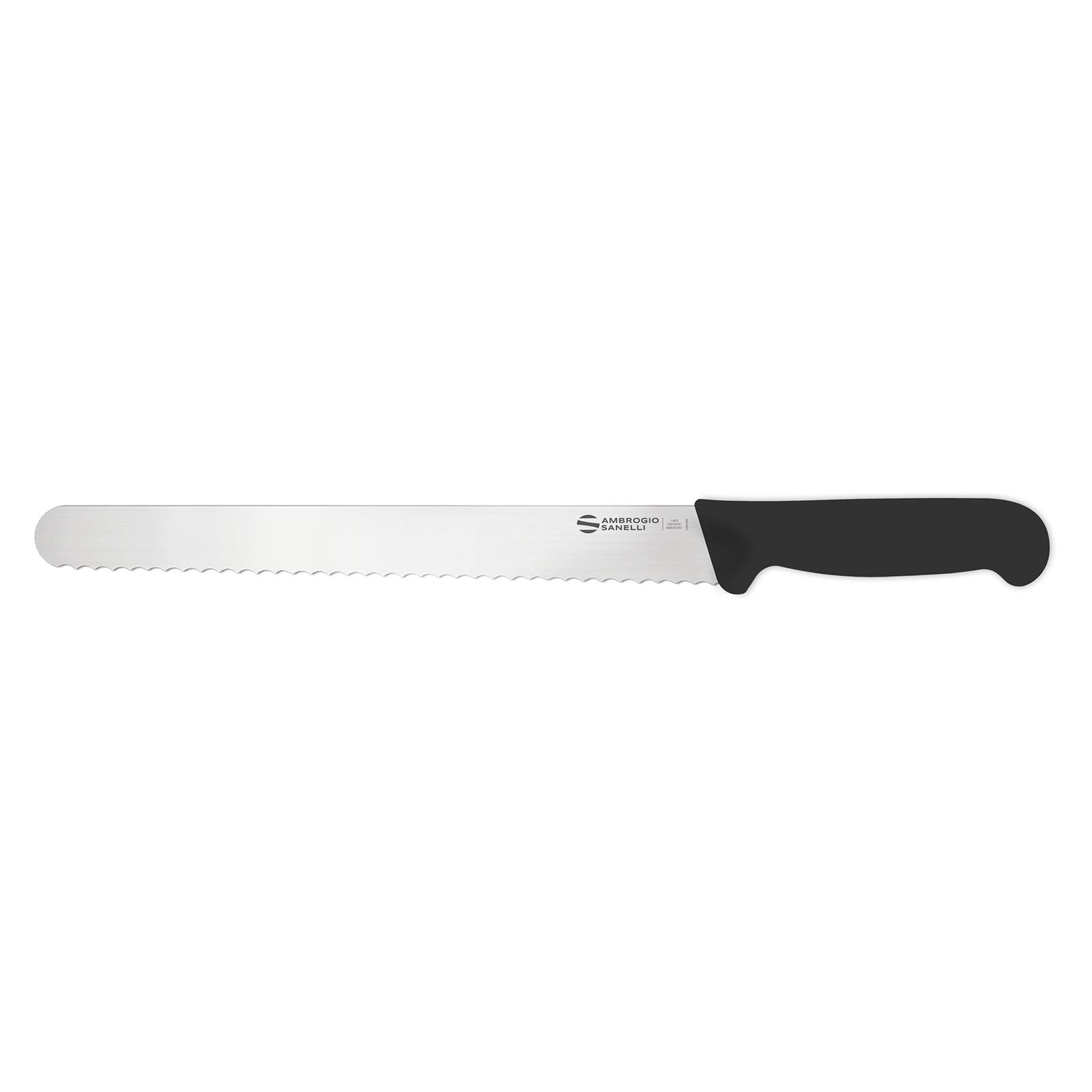Профессиональный нож Sanelli SP63024B серии Supra с длиной лезвия 24 см — это специализированный инструмент, разработанный для идеального и чистого разрезания хлебобулочных изделий любой плотности. Оптимальная длина лезвия, позволяющей справляться как с большими буханками, так и с багетами, не сминая при этом мякиш. Ключевая особенность этого ножа — зубчатая заточка, которая действует по принципу пилы, гарантируя легкое проникновение сквозь хрустящую корку и предотвращая прилипание теста к полотну.