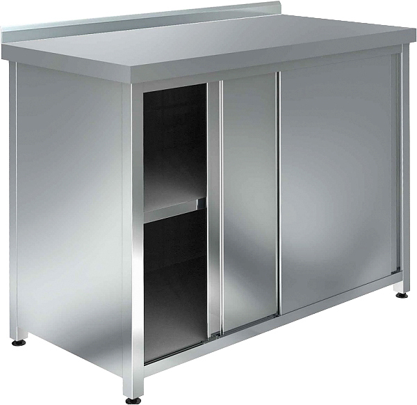 Модель выполнена из высококлассной стали, устойчивой к коррозии, влаге и воздействию агрессивных моющих средств. Двери-купе скрывают вместительное внутреннее отделение, защищая содержимое от пыли и загрязнений. Столешница выдерживает интенсивную эксплуатацию и подходит для различных производственных операций.