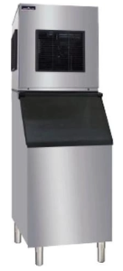 Конструкция выполнена из нержавеющей стали марки AISI 304, устойчивой к коррозии и простотой в уходе. Бункер объемом 160 кг поставляется отдельно, дверь выполнена из прочного пластика. Система воздушного охлаждения снижает нагрузку на оборудование и повышает его надежность. Льдогенератор работает от сети 220 В, потребляемая мощность — 880 Вт. Поставка осуществляется в 2-х отдельных местах: льдогенератор и бункер.
