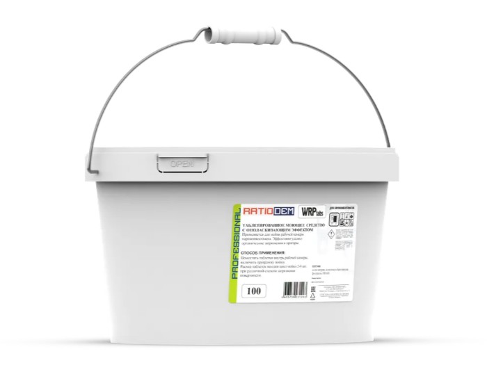 - 1 пластиковое ведро с крышкой содержит 100 индивидуально упакованных таблеток средства;