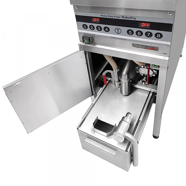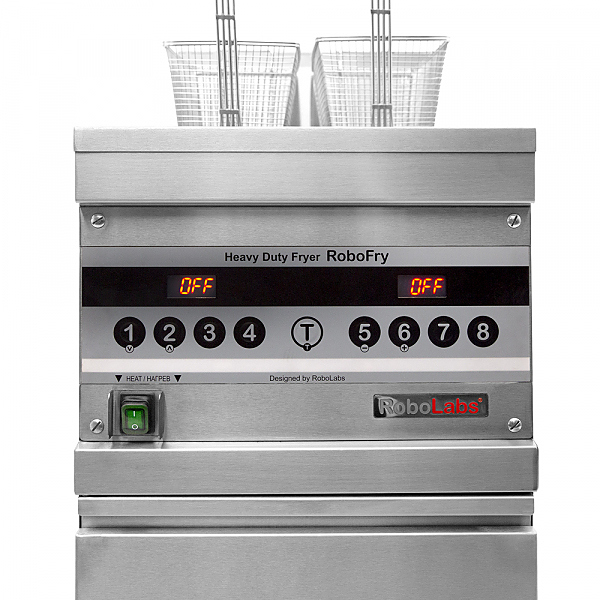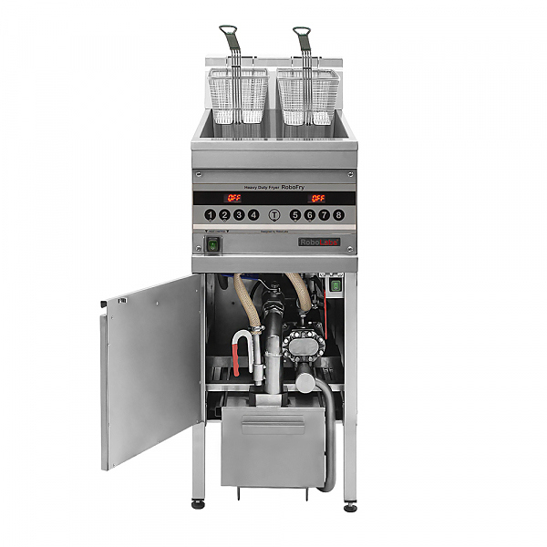 Фритюрница RoboLabs RoboFry RF — это профессиональное решение для заведений с высокой нагрузкой, оснащённое системой фильтрации масла и надёжной автоматикой. Вместительная ванна объёмом 29 л позволяет готовить большие партии, а наличие холодной зоны защищает масло от преждевременного окисления. Управление осуществляется через контроллер ROBOTRON, поддерживающий до 8 программ с возможностью точной настройки параметров для каждой корзины.