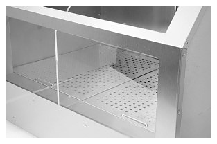 2 секции разделены перегородкой, что даёт возможность раздельно хранить разные виды попкорна — сладкий и солёный. Механическая панель управления проста и надёжна в эксплуатации. Встроенная подсветка подчёркивает привлекательный вид продукции и делает оборудование заметным для покупателей. Витрина идеально подходит для кинотеатров, кафе и торговых точек HoReCa.