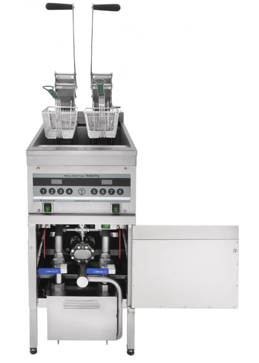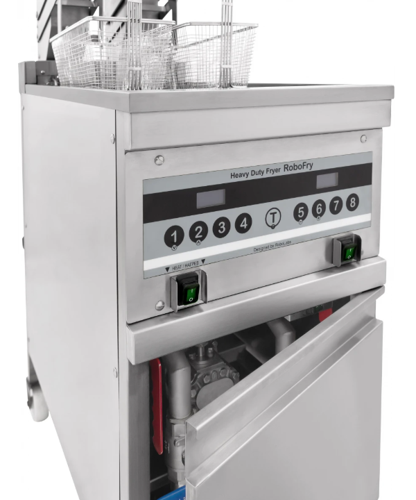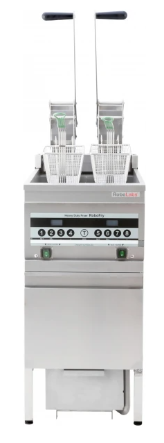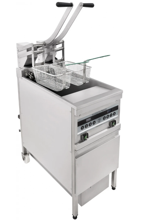 Фритюрница поддерживает рабочий диапазон от +80 до +190 °C, оснащена защитой от перегрева и ручным механизмом подъёма ТЭНов для удобного обслуживания. В комплект входят 2 корзины из нержавейки и набор из 10 фильтров.