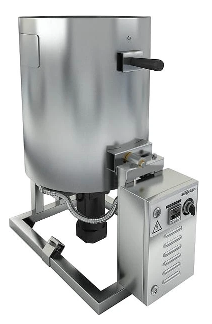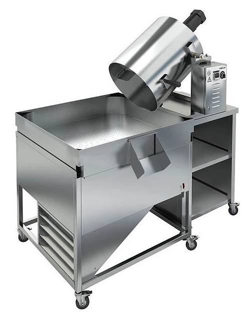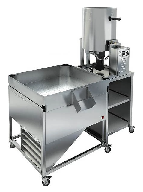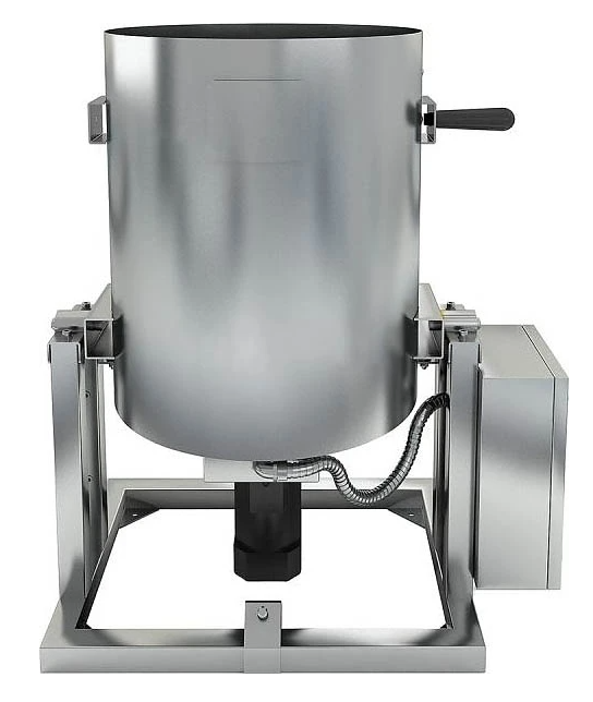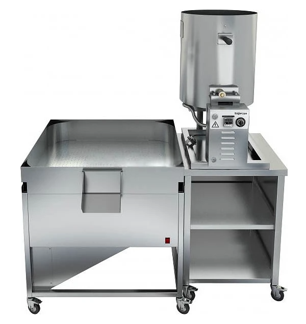 Конструкция выполнена из нержавеющей стали, устойчива к нагрузкам и проста в уходе. Опрокидывание котла вправо и удобная ручка для выгрузки значительно упрощают процесс работы. Разовая загрузка карамели составляет 3,9 кг. В комплект входят пластиковый порционный бак на 37,5 л и крышка из нержавеющей стали, что делает эксплуатацию ещё более практичной.