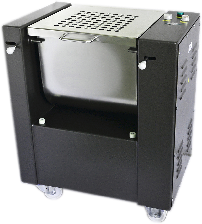 Конструкция аппарата ориентирована на удобство эксплуатации и безопасность персонала. Дежа объемом 40 литров оснащена крышкой с дозирующими отверстиями для поэтапного внесения компонентов без остановки процесса.