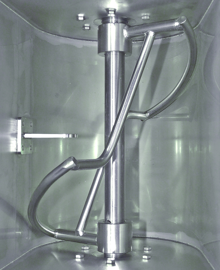 Бункер откидывается вниз на угол до 90 градусов, упрощая выгрузку готового продукта. Передача крутящего момента осуществляется через цепной механизм, что обеспечивает надежность и стабильность работы узлов.